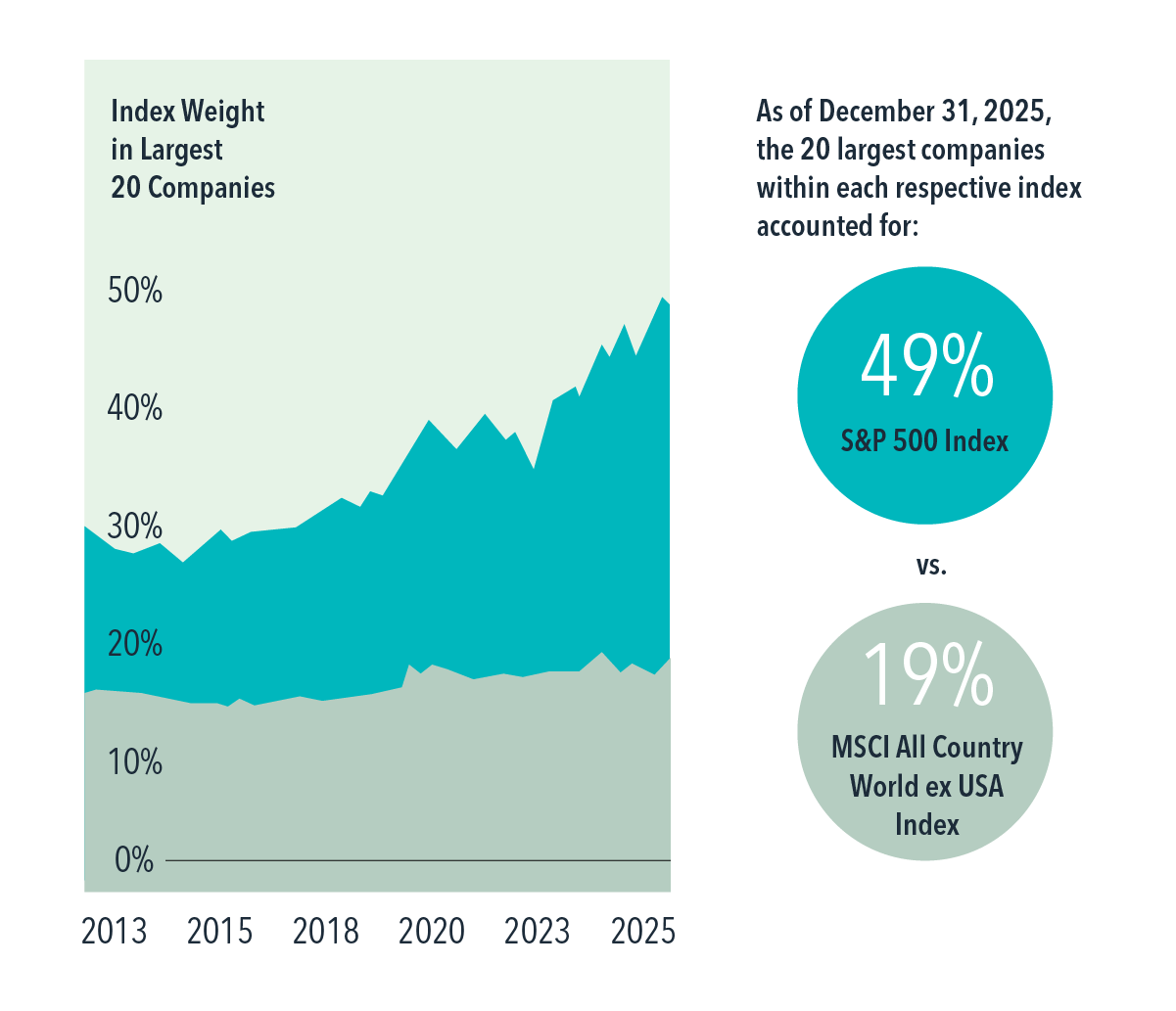 Taking a global perspective can help mitigate concentration concerns. The largest stocks represent a smaller share of markets outside the US, and that share has risen at a slower rate. At the end of 2025, the largest 20 stocks accounted for just 19% of the MSCI All Country World ex USA Index, a modest increase from approximately 16% at the start of 2013.