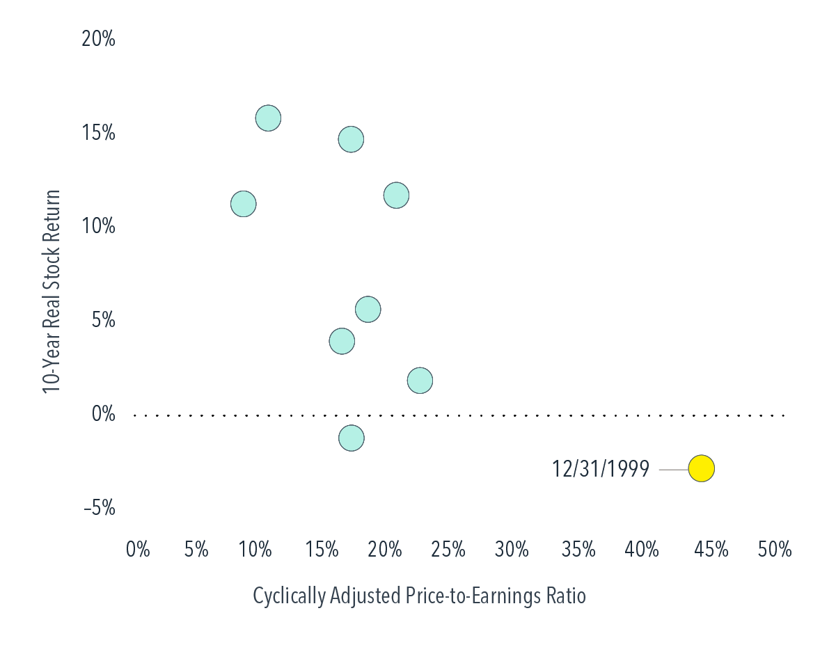 CAPE Ratio at the End of Each Decade vs. Real US Stock Returns over the Next 10 Years