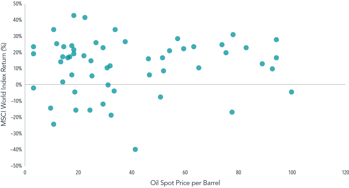 Market volatility rose and oil prices spiked after the US and Israel struck Iran in late February, with hostilities continuing in Iran and elsewhere in the Mideast into March. The impact on crude supplies helped push oil prices notably higher.5 Amid growing concerns about energy, it is worth remembering that global equity returns have not been correlated with the level of oil prices (see Exhibit 1). While the cost of oil may have some impact on markets, it is just one of many factors that investors consider when looking at market performance.